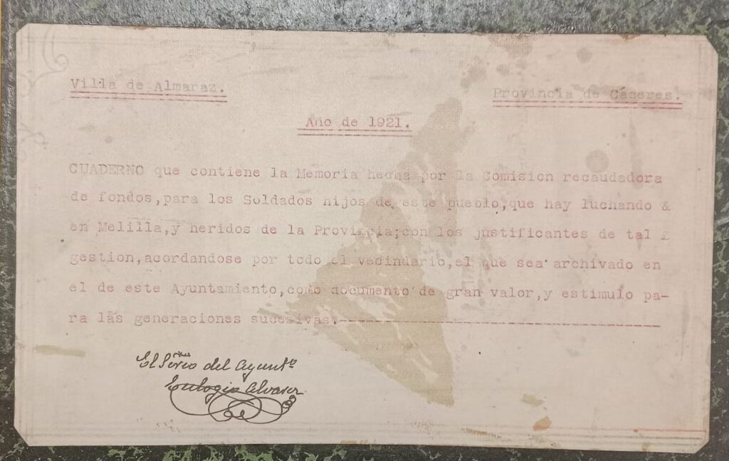 Cuaderno que contiene la memoria hecha por la Comisión Recaudatoria de fondos para los soldados hijos de este pueblo que hay luchando en Melilla y heridos de la provincia.