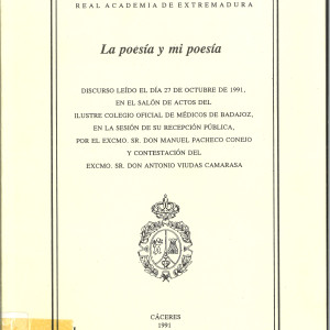 La poesía y mi poesía : discurso leido el dia 27 de octubre de 1991 en el salón de actos del ilustre Colegio Oficial de Médicos de Badajoz, en la sesión de su recepción pública, por el Excmo. Sr. Don Manuel Pacheco Conejo y contestación del Excmo. Sr. Don Antonio Viudas Camarasa.-- Cáceres : Real Academia de Extremadura, 1991.