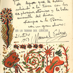 Con esta exposición queremos celebrar el centenario del nacimiento de Manuel Pacheco (Olivenza, 1920-Badajoz, 1998), poeta de honda preocupación social, de inquietantes e inesperadas imágenes surrealistas, de ritmo perfecto en el metro clásico y de continua búsqueda de una manera de decir propia. Destacamos en esta exposición un ejemplar de la primera edición de “Ausencia de mis manos”, su primer libro, con ilustraciones de Manuel Terrón; una serie de poemas mecanografiados, corregidos a mano y firmados por el autor; un ejemplar de la primera edición de “En la tierra del cáncer”, dedicado por Pacheco y con una ilustración original de Lencero...